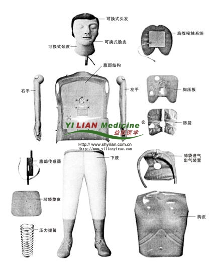 心肺復蘇模擬人由人體模型和心肺復蘇控制器組成。人體模型結構是:可換式頭發,可換式臉皮,可換式頸皮,左手,右手,腹部結構,胸腹接觸系統,胸壓板,肺袋,下肢,腹部傳感器,肺袋墊皮,壓力彈簧,肺袋進氣出氣裝置,胸皮等。
