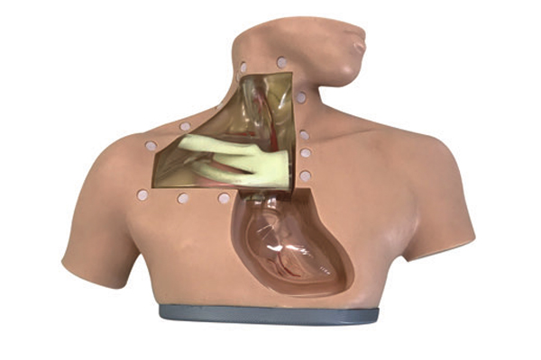 2.通過透明設計的中心靜脈插管墊可清晰觀察到頸內靜脈、鎖骨下靜脈,并可進行經頸內靜脈、鎖骨下靜脈穿刺插管途徑操作訓練,可以進行中心靜脈置管和相關消毒.穿刺、固定等操作訓練。熟練操作后可給予患者腸外營養的治療和護理。