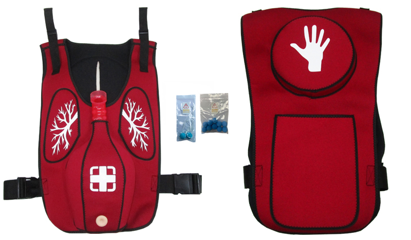 救援培訓專用窒息梗塞急救實訓穿戴馬甲,可有效避免因窒息急救不及時導致生命安全受到傷害。防窒息急救教育和實訓的時候,穿戴在學員身上,針對異物造成的呼吸氣道堵塞狀況時,練習腹部按壓(即海姆立克手法),做出正確步驟處理,擠出堵塞氣道異物(異物塞).直觀的教學模式給學員帶來自信和應用實效。模擬者可采用站姿、坐姿、用教具或借助柜臺、桌椅,實習體驗窒息自救、急救、達到救人一命的教學目的。