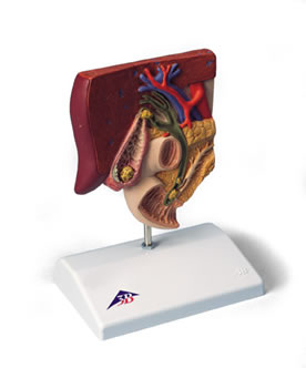 這款為病人解釋病理之用的模型展示的是膽囊系統及周邊,實物一半大小。膽囊壁上有嚴重的炎癥(膽囊炎),及炎癥后的組織變化。結石分布在如下典型部位: