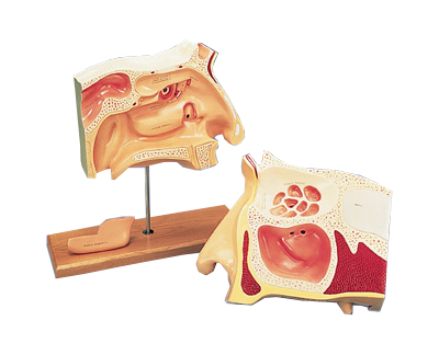 這款模型4倍放大展示了鼻腔和頸內動脈及視神經,鼻中隔可拆卸,以展示鉤裝突起、漏斗和篩骨泡。篩骨泡打開,以顯示內窺鏡到達篩骨細胞的途徑。置于基架上,帶有英文注釋。