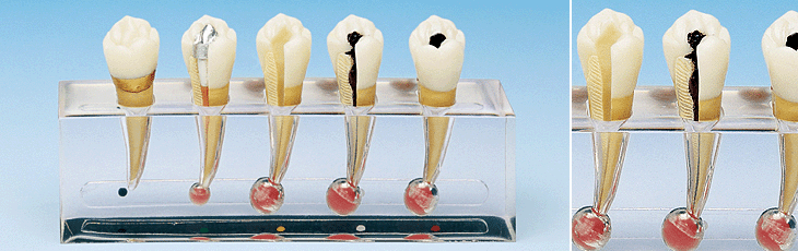 功能特點:該模型由因齲齒缺損形成齲洞、牙髓壞死(變黑),伴根尖膿腫和作好充填準備的前磨牙以及用合金充填修補的牙齒等5個部件組成,并顯示齲齒與牙髓炎伴根尖膿腫等病理過程以及臨床治療。