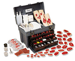 A comprehensive selection of casualty simulations including such realistic bleeding strap-on and stick-on wounds and injuries as compound extremity fractures, various burns, puncture wounds, eviscerations, lacerations, fractures, flesh wounds, fragment wounds, and foreign body protrusions. Simulation make-up, accessories, and makeup tools are provided for staging "victims" to appear to be in shock or pain, traumatized, lacerated, burned, bleeding, and/or dirty. Bleeding wounds have plastic reservoir pump assemblies to ensure a continuous lifelike flow of simulated blood. All components come in a carrying case with drawers and compartments (22" x 13" x 15").