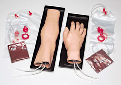These training aids were designed for practice in giving IVs. They permit detailed exercises in venipuncture so that the technique can be mastered on a realistic model before actually administering to patients. The students can palpate the arm and hand, which are made of supple, resilient plastic with a human feel. The vein is located, the needle introduced, and blood is withdrawn or fluid injected. The models can be used repeatedly. Complete with blood powder and carrying trays.
