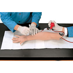 In the tradition of Life/form® products, the Arterial Puncture Arm features the realism of appearance and performance necessary to provide realistic practice for trainees. Easy to set up and use, this valuable training aid is ideal for practice and demonstration in drawing arterial blood samples for monitoring blood gases. With this unique arm, students can actually identify puncture locations through palpation of the pulse at either the radial or brachial sites. Realistic arterial pressure produces a lifelike backflow of blood in the syringe, confirming proper needle location in the artery. MAINTENANCE: The Life/form® Arterial Puncture Arm is easily maintained with replaceable skin and arteries. Complete Skin/Artery Kits are available and easy to use. Periodic use of the tubing sealant provided will extend the life of each Skin/Artery Kit. Two replaceable tubing sections are included with each Skin/Artery Kit (one section in the arm). Life/form® Arterial Puncture Arm includes : two 3 cc syringes with needles, fluid supply bag, two replacement sections of artery, 1 pint Life/form® Arterial Blood, teaching guide, and hard carrying case. One-year warranty. |