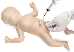 Female newborn infant reproduction designed for the practice of umbilical catheterization.